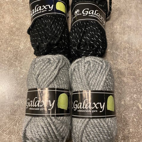 Reflekterande garn Tindra. 4 nystan svart, 2 nystan grå på vardera 50 g. Skickar med ett nystat på 43g. 84% akryl och 16% polyester.