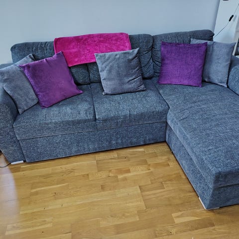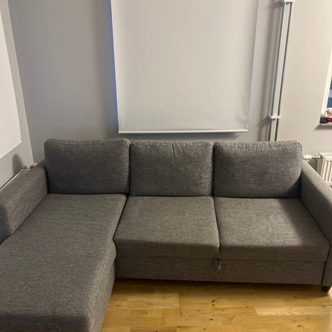 En grå divan soffa, med förvaring på längre sidan. Som går och göra till en dubbelsäng, ingen bärhjälp finns. En trappa upp, kanske kan hjälpa att skruva isär. Hämtas omgående. Lite klös märken på sidorna pga katt, och en nagellacksfläck på nedre sidan. (Djur finns i hemmet)