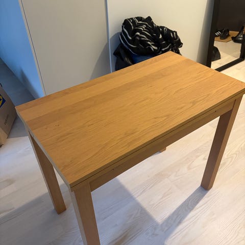 Svart klaffbord i trä med utdragbar låda. Två matchande stolar med snyggt tyg. Från ikea. Ledsen vet ej namn på möbel. Perfekt compact living!
