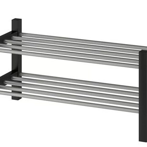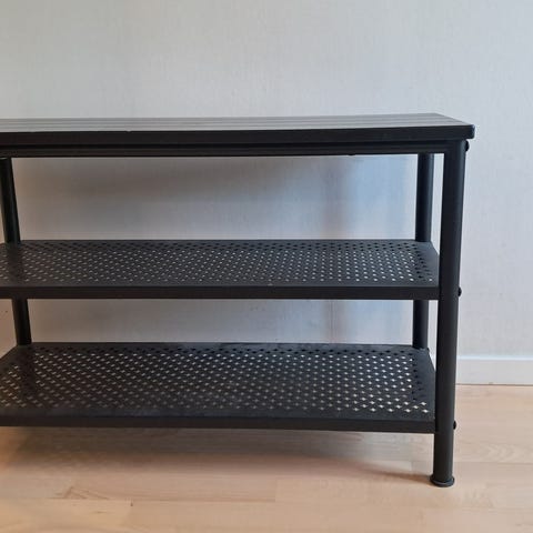 En stabil svart skohylla i metall med två hyllplan. Finns att hämta i centrala Göteborg.