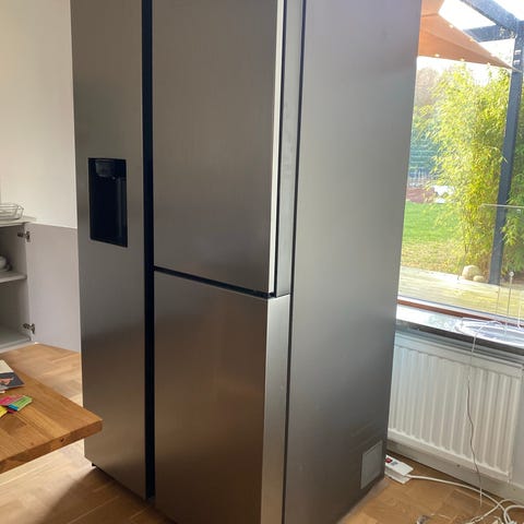 Samsung Side-by-Side kylskåp i vit färg. Modellen är utrustad med två dörrar och har en rymlig interiör med hyllor och fack för förvaring av matvaror. Kylskåpet är energieffektivt och har ett modernt designat handtag i metall. Passar för hushåll som behöver stor kyl- och fryskapacitet. 2 x H:180 D:68.4 B:59.5