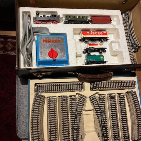 Ett 40-tal rälsbitar, ett lok, 4 vagnar, transformator, 4 växlar och ett litet stationshus😀