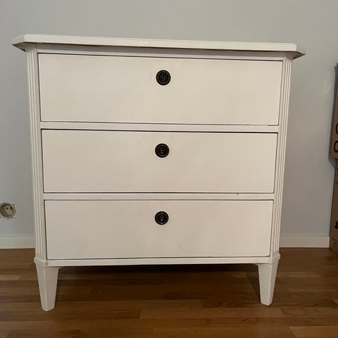 Välhållen nätt byrå i gustaviansk stil med kalkstenskiva. Nyckel finns, lås och lådor i perfekt skick och fullt fungerande. Kommer från min mormor och morfars hem och gissa att den är från trettiotalet. Spegeln säljs separat för 500 kr och har alltid hört till