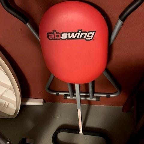Ab Swing träningsutrustning med röd sittdyna och grå metallram. Används för magträning och kroppsstyrka.detta är nästan oanvänds , lett ihop fällbart , finns i Västerås .