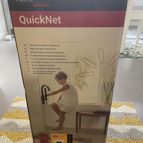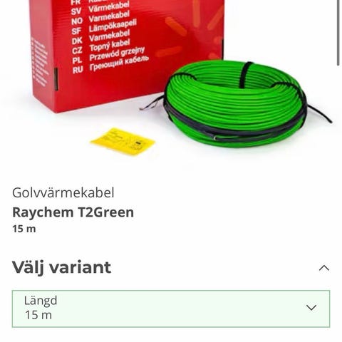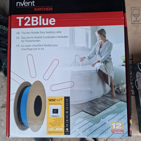 Helt oanvänd paket med T2 blå (10W/m) golvvärmekabel inklusive termostat. Kabeln är 50m lång. Så totalt 505w på den kabeln.