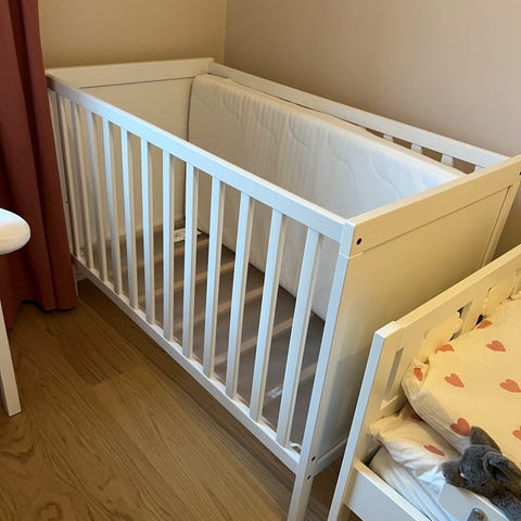 IKEA spjälsäng med måtten bredd 80 cm, höjd 80 cm och bäddbredd 60 cm. Bäddlängd är 120 cm & maxbelastning är 20 kg. Frihöjd under spjälsängen är 13 cm.