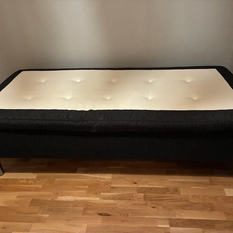 Jysk resårmadrass med bäddmadrass , ben och sänggavel färg svart, aldrig använd bara stått uppställd hemma
