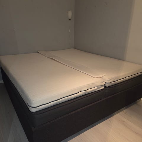 Kontinentalsäng med ny Valevåg pocketresårmadrass från IKEA.
