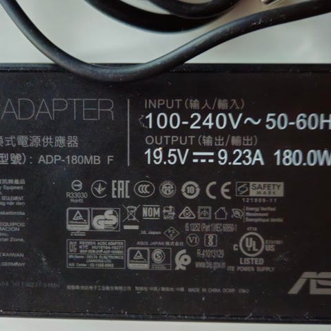 Asus adapter för dator, svart färg, med tillhörande kablar.