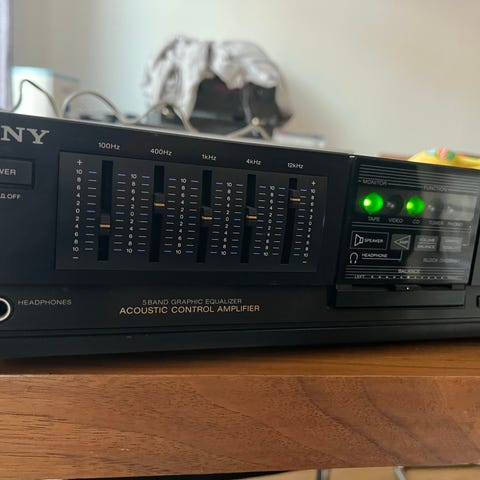 Hitachi HA-350 stereo förstärkare med analoga mätare, ljudkontroller för bas och diskant, balans- och volymreglage. Utrustad med ingångar för bandspelare och hörlurar. Tillverkad i metall med en svart och silverfärgad design.