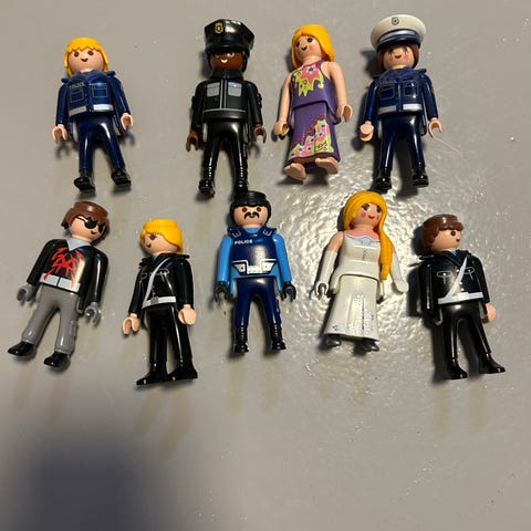 Jag säljer en Playmobil-polisbil med två figurer och en skylt. Bilen är i perfekt skick; strålkastarna och bakljusen fungerar utmärkt, och det blå ljuset fungerar utan problem.