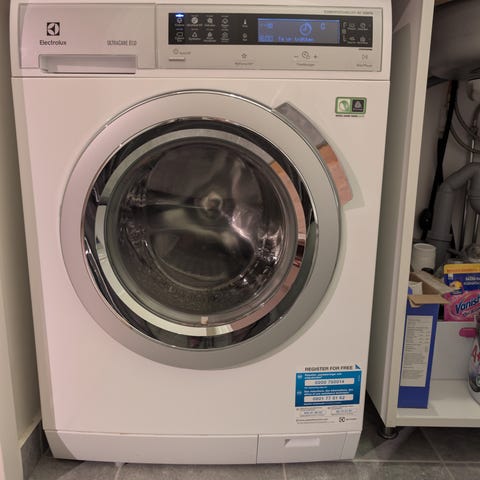 Electrolux frontmatade tvättmaskin. Vit färg. Maskinen är utformad för att tvätta kläder med frontmatning.