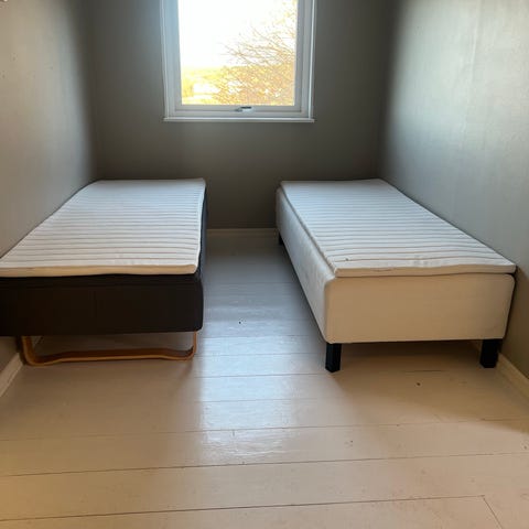 Skänkes dubbelsäng med sängstomme i oljad ek och 2*90 Hildingmadrasser.
