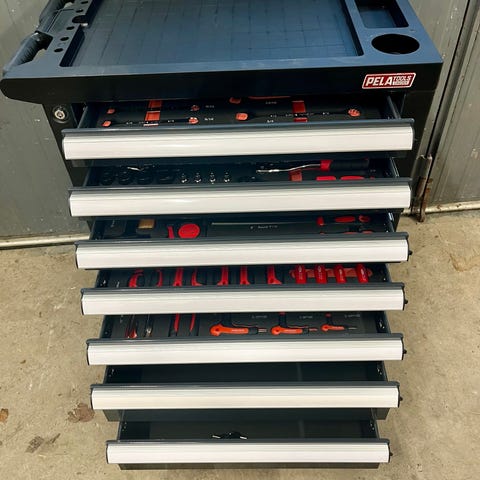 Verktygsvagn komplett med verktyg i mm från Pela. Hel och fin vagn, Verktyg använda. Se bilder för vad som är med, saknas lite från ny.