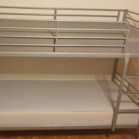 Barn/familjesäng 140 cm + 90 cm. Cirka 5 år gammal. Använt men ok skick. Målad i ljusgrå färg som nöts i kanten på några ställen.