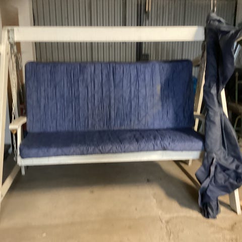 Äldre hammock från 50-talet. Dynorna är omklädda, men behöver nog en tvätt. Ramen skulle bli fin med lite ny färg. I övrigt hel och fungerande! Står vid min kolonistuga i Skrubba för upphämtning.