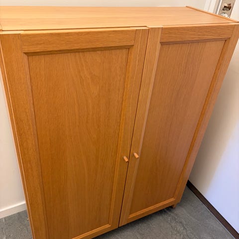 Litet fint väggskåp, använt som nyckelskåp. Oljad ek
