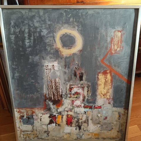 Abstrakt konstverk i form av en tavla med en färgglad komposition. Tavlorna innehåller nyanser av blått, gult, grönt och svart med inslag av cirkelformer och strukturerade mönster. Signatur finns i nedre hörnet. Passar för inomhusdekoration. 1 för 800 kr eller 2 för 1000 kr.