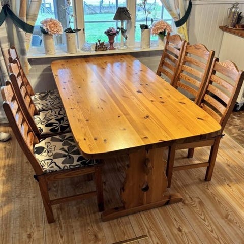 Stort matbord med 6 stolar i konstläder., bordet är som väldigt sparsamt använt stolarna har katten klöst på så antingen nöjer man sig med det eller klär om/ köper överdrag.