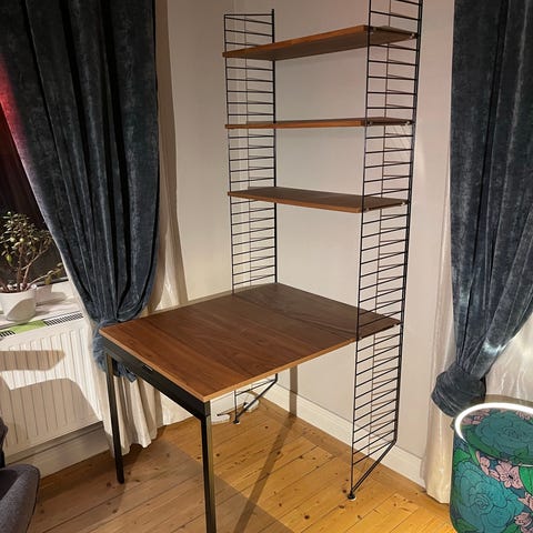 Fällbord från String som passar för String 30 cm gavlar. Gavlar medföljer ej. Några små skador, se bild - fint begagnat skick. Nypris ca 4200kr.