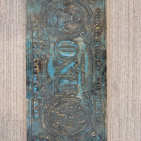 Metallskulptur föreställande en skrynklad amerikansk dollarräkning med detaljer i grönt och guld. Skulpturen har en oregelbunden form och visar text och symboler från dollarräkningen.