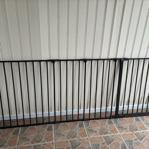 Barngrind för dörröppningar och trappor. Justerbar för att passa olika stora öppningar. Kräver att den skruvas fast i båda ändar. Smidig att öppna för vuxen.