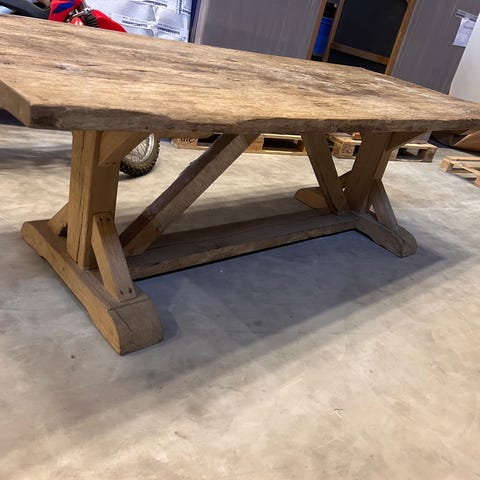 Stort äldre matbord med två extra skivor. I jakaranda träslag. Skivorna förvaras under bordet, vilket är smidigt. Överlag i fint skick. Skivorna är i annan nyans, då de knappt används. Enkelt att få plats med 10 personer runt bordet