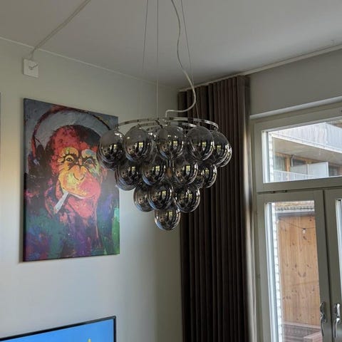 Lampan kräver en ljuskälla med stor sockel (E27) om max 60W eller motsvarande i LED, ingår ej. Krävs en lampkontakt eller någon koppling för kontakt.