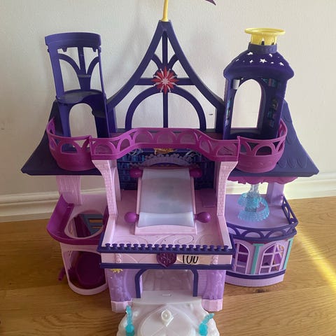 Leksaksslott i plast med flera våningar. Slottet är färgglatt med rosa, lila och gula detaljer. Lämpligt för barn och lek.