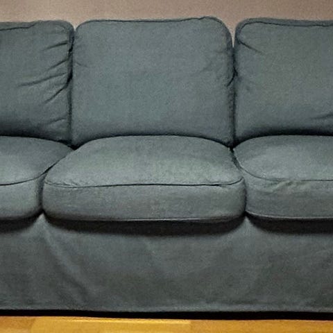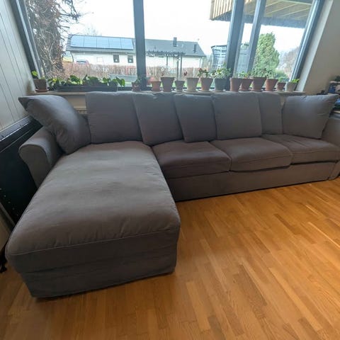 En av kuddarna har bytts ut mot en "vanlig" kudde och klädseln har några fläckar på sig. Soffan är använd och lite sliten men otroligt skön och har flera goda år kvar. Men den behöver lite TLC. Ska gå att köpa nya kuddar och klädsel tex, om man vill det.