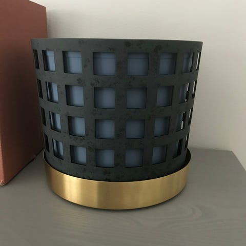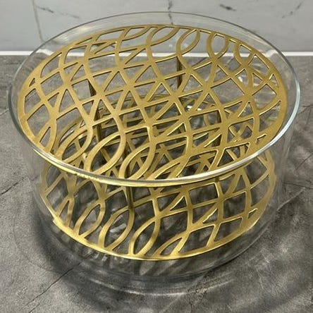Produkten har ett mönstrat metalllock med en rund form och transparent glasbehållare.