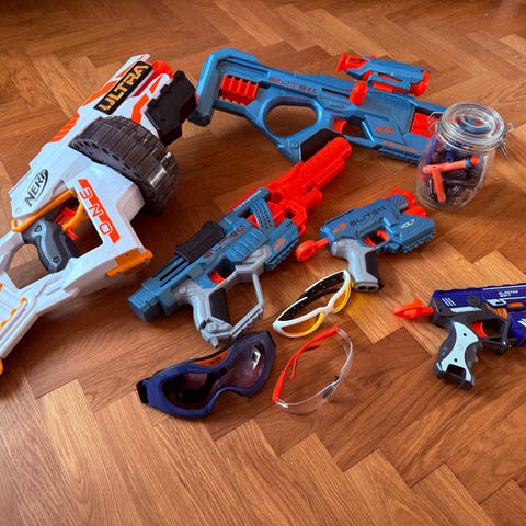 Nerf set med flera leksakspistoler och tillbehör