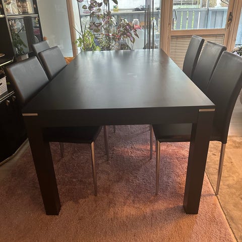 Matbord med svart bordsskiva och ljusa ben.