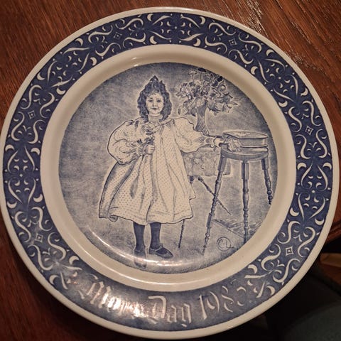 Vacker tallrik med klassiskt allmogemotiv och blommor runt kanten.