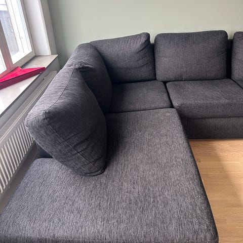 Soffa i märkgrått, Divan på ena sidan ocH schäslong på andra. Ganska stor soffa.
