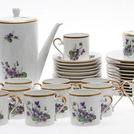 Fin mat- och kaffeservis med en fin blå dekor. Innehåller mattallrikar, djupa tallrikar, assietter i 2 olika storlekar 6 st. av varje, 5 uppläggningsfat och 1 såskopp. Kaffeservisen innehåller 10 koppar med fat, gräddkanna, sockerskål och kaffekanna. 2 äggkoppar och 2 ljusstakar.
