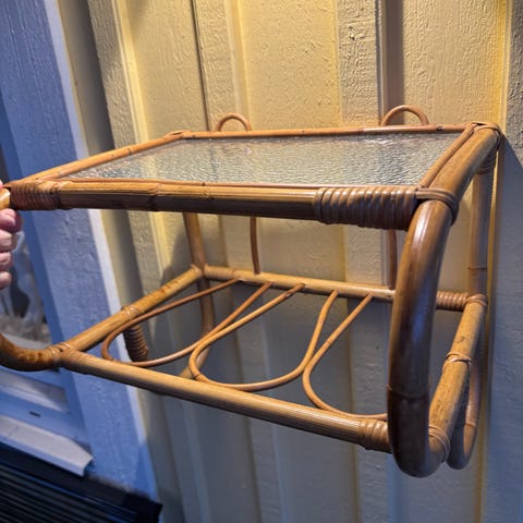 Ett charmigt litet bord för blommor med en stomme i rotting och en rund vågig glasskiva. Perfekt som ett litet sidobord för blomma eller som en dekorativ detalj i hemmet. MYCKET fint skick!