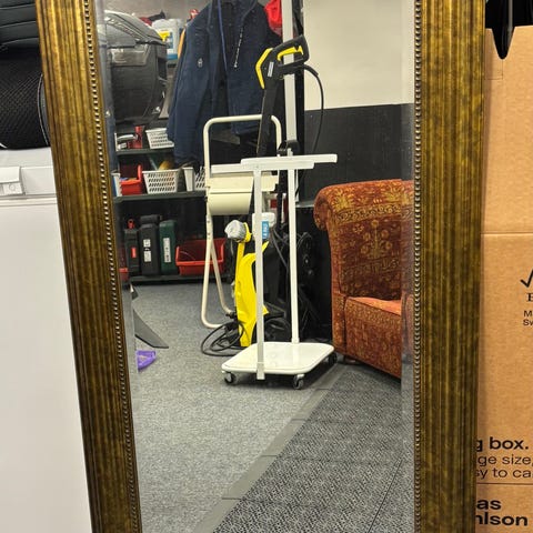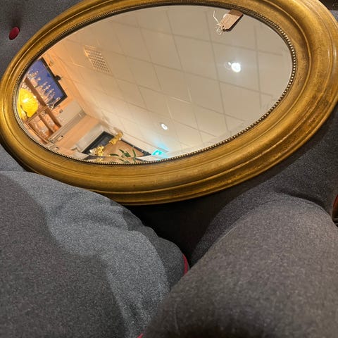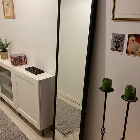 Snygg IKEA spegel i silverfärgad ram med slipad glaskant, lämplig för användning i hall, sovrum eller vardagsrum.