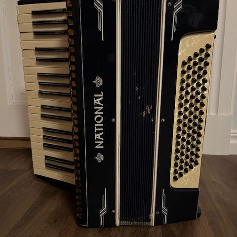 Craneessi dragspel med knappar och bältesrem. Instrumentets yta har en marmorerad grön färg och svart dragspelsskinn.