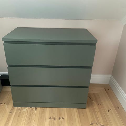 IKEA Malm byrå i svartbrun färg. Byrån har flera lådor för förvaring och är tillverkad i material som ger en stabil och funktionell möbel.