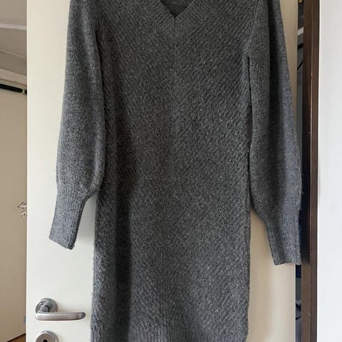 Ribbstickad klänning i storlek S, tillverkad av ullmaterial. Klänningen är grå i färgen och har lång ärm med ribbstickat mönster. Designad för kvinnor och passar för vardagligt bruk.