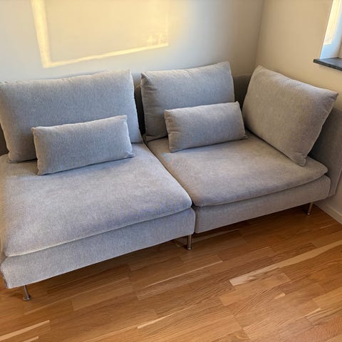IKEA Söderhamn 1-sits sektion och fotpall i Tallmyra ljusgrön säljes. De är fristående från varandra men går enkelt att sätta ihop med skruv (inga hål är gjorda). Vi har använt en snabbtving undertill för att ha dem ihop.