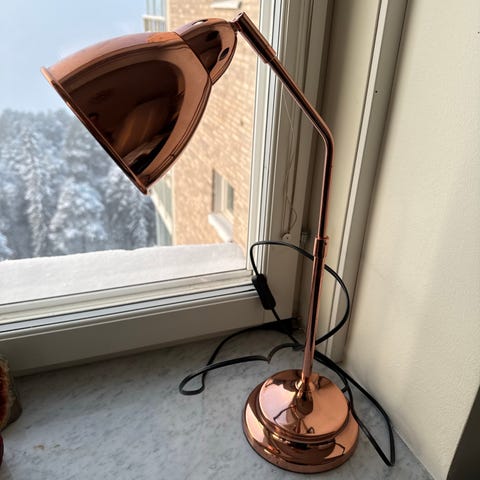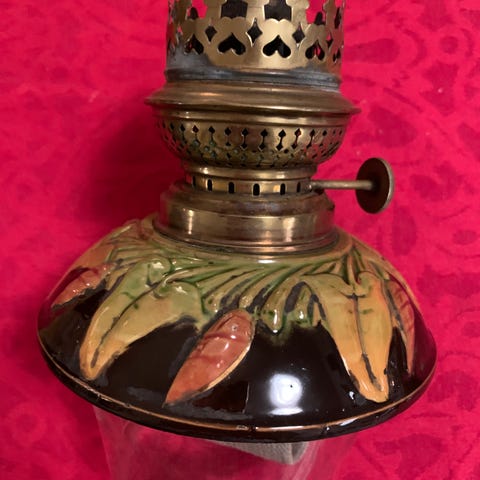 Kopparlampa med glasbehållare och dekorativ metallram. Lampan har en klassisk design med en rund kopparskärm och en glaskupa. Passar som dekorativ belysning i olika miljöer. Drivs med batteri.