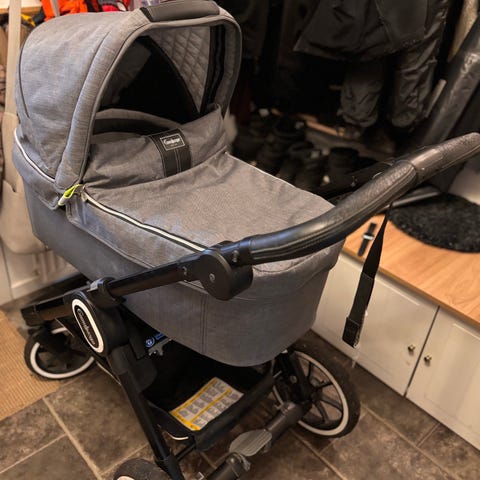 En stabil och mysig vagn med nya låsbara lufthjul. Fotsäck, regnskydd och två olika dynor ingår. Vinteråkpåse finns att köpa till.