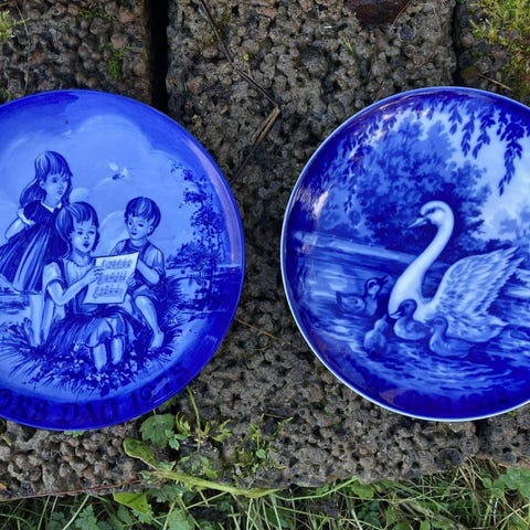 Set med blåvita porslinstallrikar med dekorativa landskapsmotiv. Innehåller en större tallrik och två mindre tallrikar. Passar för servering och dekoration.