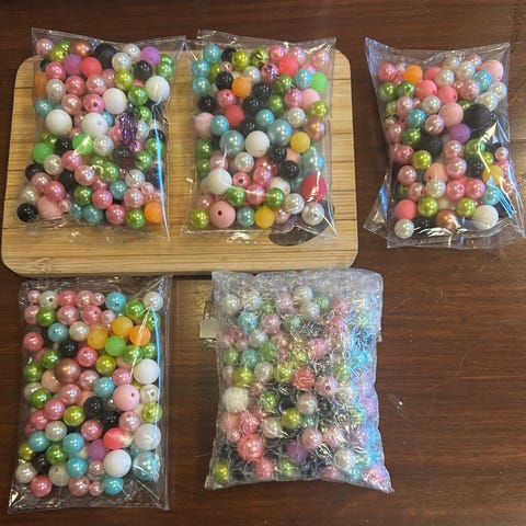 Blandade pärlor (glas, sten, metall, trä, fimo, plast, ...). För tillverkning av smycken och annat hantverk.