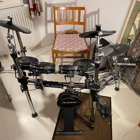 Setet inkluderar trummodul med olika ljud och effekter, cymbaler, trumplattor, trumstockar och pedaler. Passar för övning och musikproduktion i hemmiljö.