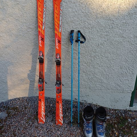 Alla grejerna är välanvända vilket syns, men allt är fullt funktionsdugligt utan några brister. Skidorna och pjäxorna har tejprester som går att pilla bort för den ihärdige. Det är dock inga tejprester eller annat på undersidan av skidorna.