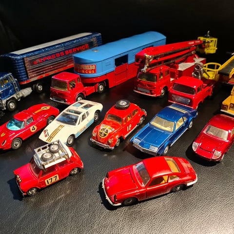 En samling äldre leksaksbilar i varierande skick.