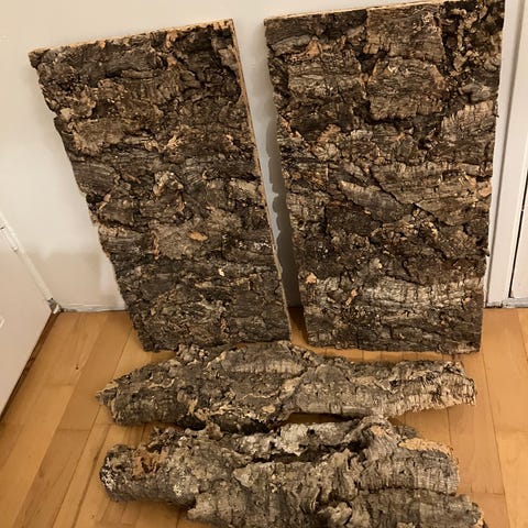 Säljer fyra stycken fina bitar av naturlig korkbark i olika storlekar. De har tidigare använts i terrarium och har en fin patina. Perfekta som gömställen, klättermöjligheter eller bakgrundsmaterial för både ödlor, ormar och spindlar.